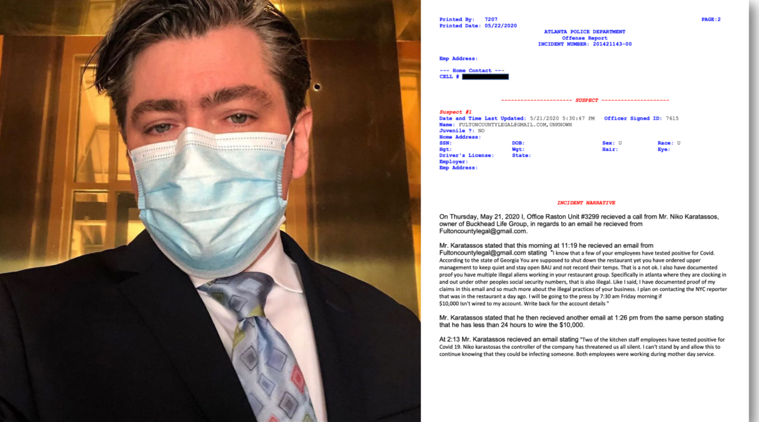 Karatassos received several emails from an “unknown person” alleging the popular Atlanta hospitality company kept its Chops Lobster Bar restaurant open even as employees fell ill with COVID-19, and demanded $10,000 to keep quiet, according to a statement from APD.