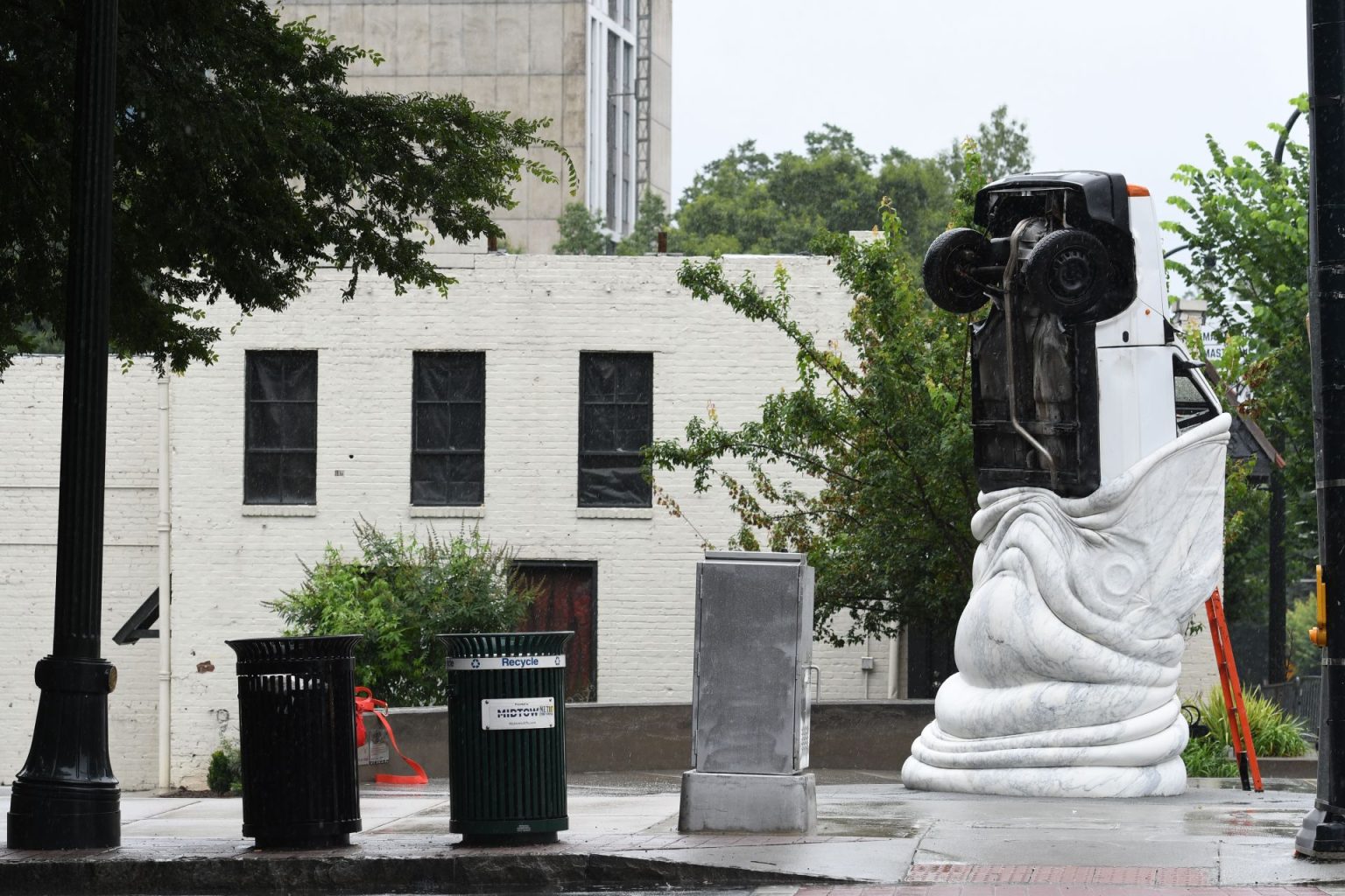 A sculpture early Friday emerged of what seemed like a white pick-up truck being swallowed whole by a Jabba-The-Hutt-looking slab of marble.