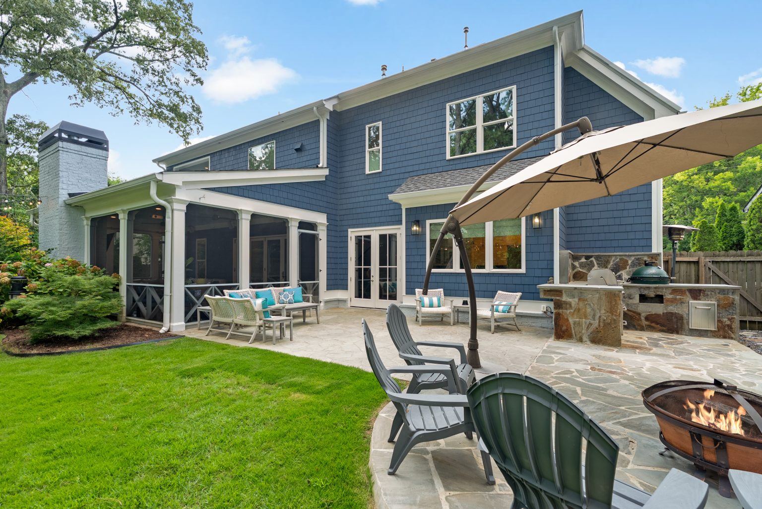 Twelve-foot accordion doors open the main living area to a 400-square-foot screened porch, fully equipped for year-round use. Features include a gas-start wood-burning fireplace, built-in TV and speaker system, a 10-foot projection screen, infrared heater, and blackout Sunbrella curtains, offering flexibility for everything from game nights to fall dinners. Just beyond, a built-in grill, stone patio, and flat backyard create a versatile outdoor space, ideal for relaxing, entertaining, or adding a future pool.