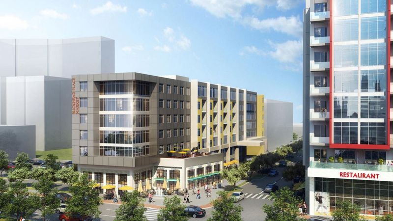 Currently, the shopping plaza features a Marshall’s, Pier 1 Imports, and LA Fitness. The new project will boast a Hampton Inn and Suites, 170 residential units, and 20,000 square feet of retail space.