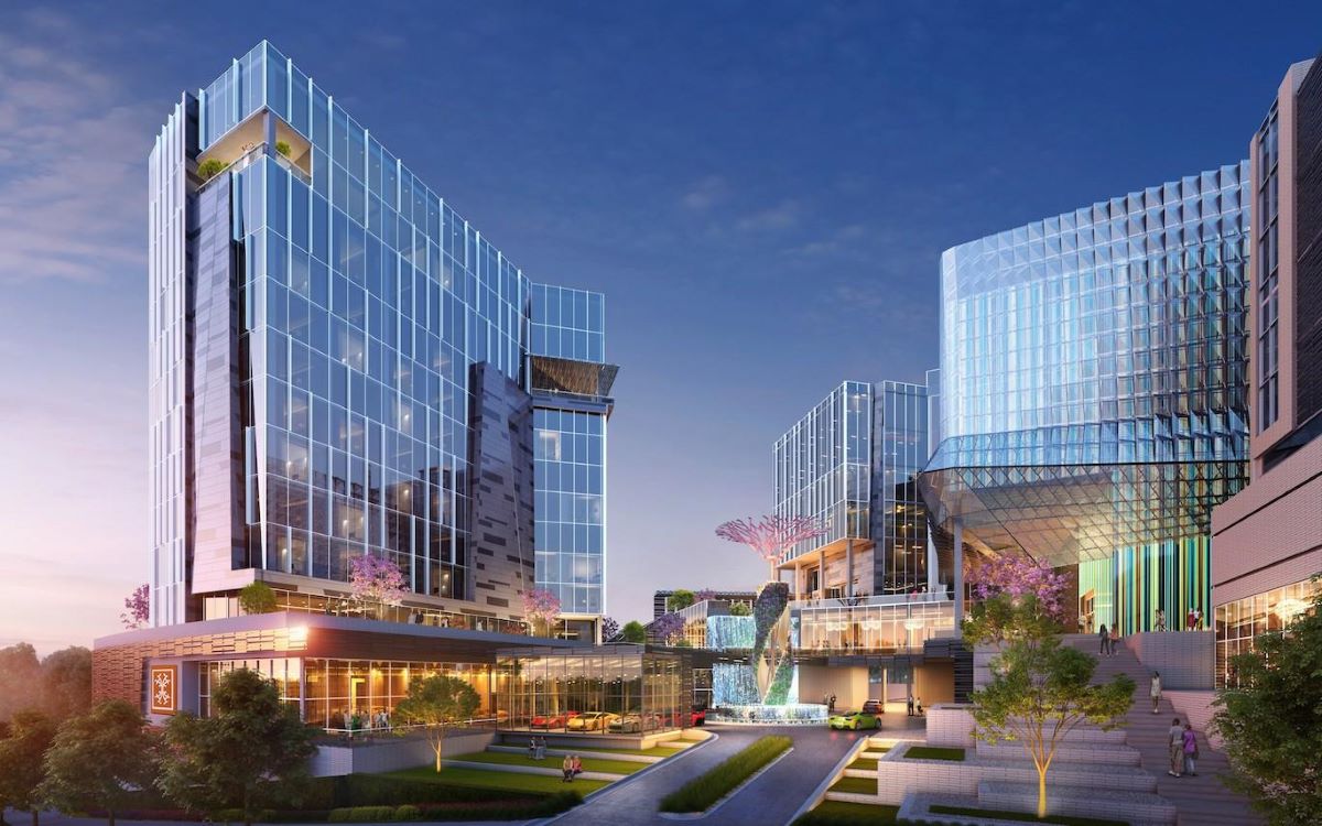 A site plan provided by ALUX to the City of Alpharetta in June depicts a wedge shaped campus with a 13-story, 123,400 square foot hotel, a 340,828 square foot structured parking lot, a 9-story, 156,400 square foot wellness center, and two low-rise commercial buildings totaling 77,700 square feet. The complex is lined by greenspace and features several plazas and a rooftop running track. Earlier plans for for-sale residential units appear to have been removed from the final draft of the project. The campus will be served by 883 structured parking spots and 57 surface parking for a total of 940 car parking spaces.