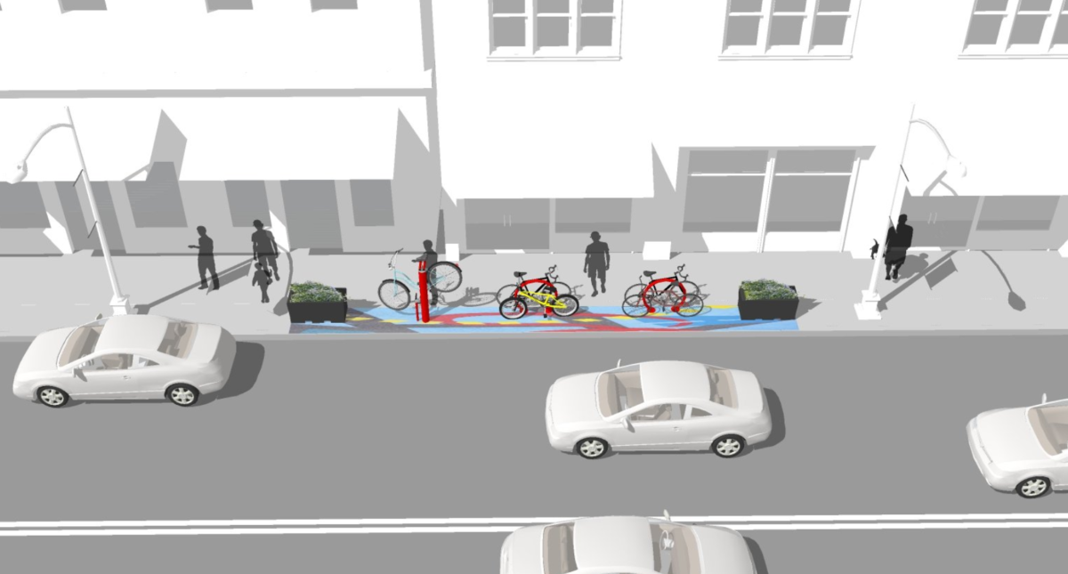 - Sidewalk-level Bike Parking – Sidewalk parking will use the sidewalk or furniture zone for creative bike parking. Sidewalks must be at least 8.5 feet to be considered.