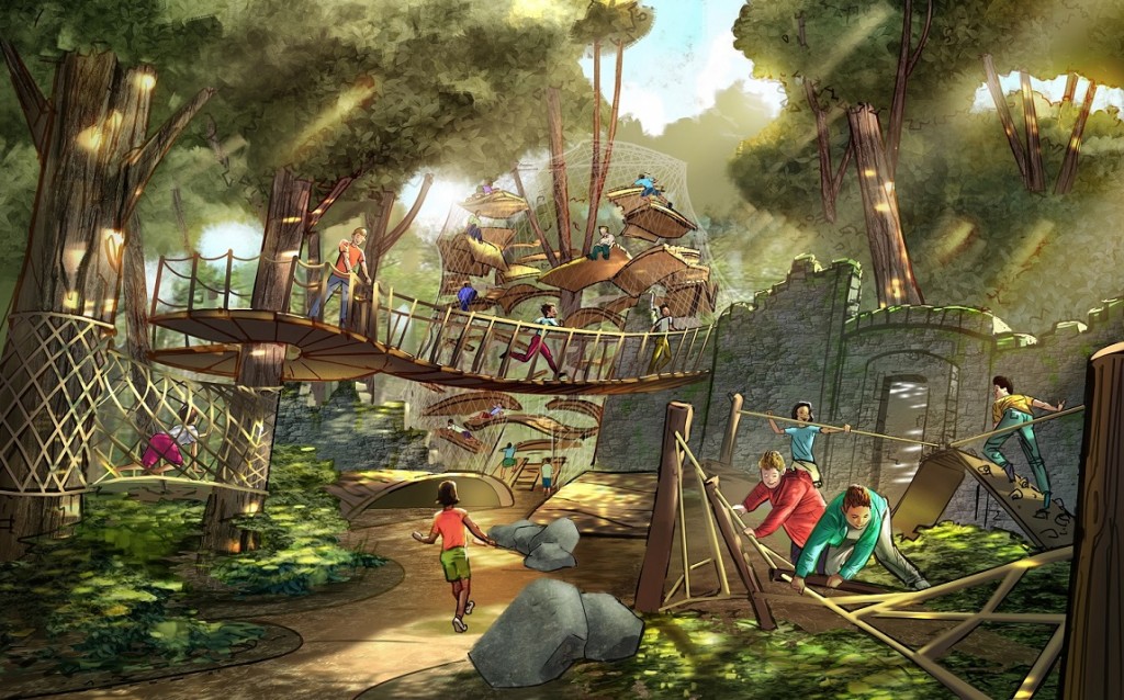 ‘Tree pods, play areas, ground trails, sensory stations, adventure nets, water cycle activities, wetland, and floating walkways set to open summer 2016.