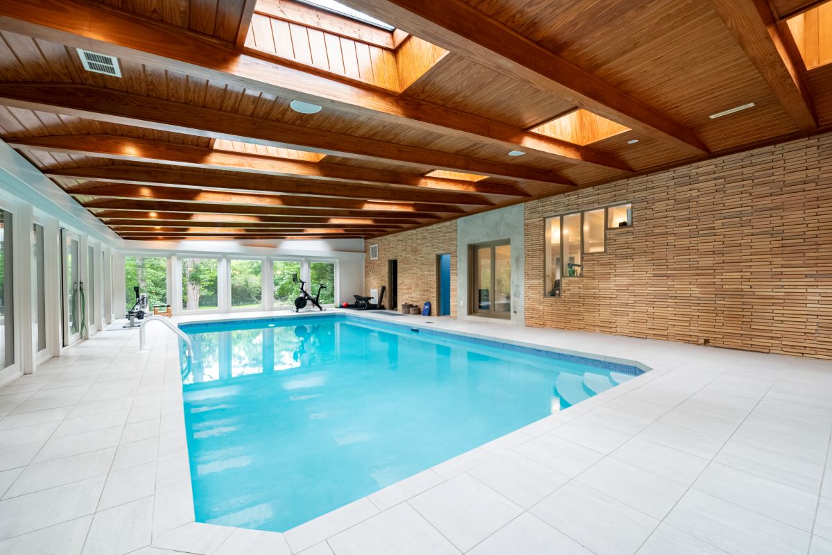 The most unique feature of the home, the indoor heated pool, was revamped during the renovations with a new roof including 12 skylights bringing the outdoors in. Sliding doors surround the pool and also give the space an outdoor feel when opened. Another standout element of the three-bed, three-and-a-half-bath house is the expansive owner’s bathroom. Consisting of a steam shower, gorgeous infinity tub overlooking the outdoors, and organized closet, it is a dream. In fact, the tub’s faucet is on the bathroom ceiling, filling the bathtub from above. There is also a dedicated office space for working from home.