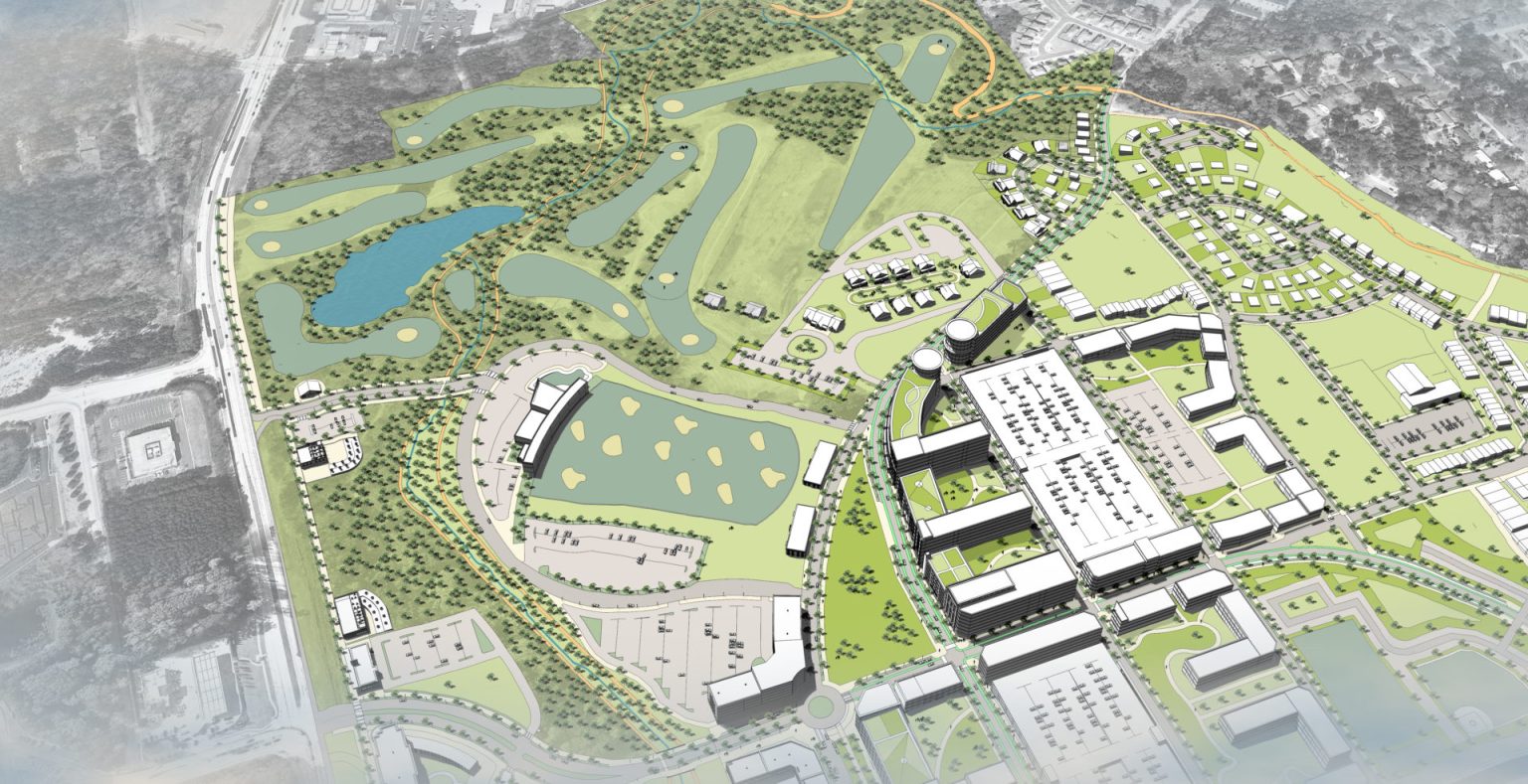 Suburban town center model in a place that could support actual urban development. A missed opportunity in the making.