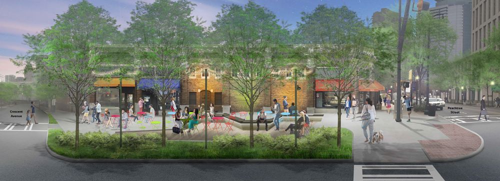 “In order to accommodate the community’s stated interests in creating more public open space, and to improve safety and access for people on foot, Midtown Alliance and the City of Atlanta’s Office of Mobility Planning are exploring ideas to redevelop open space on the northwest corner into a ‘parklet,'” according to a microsite for Commercial Row.