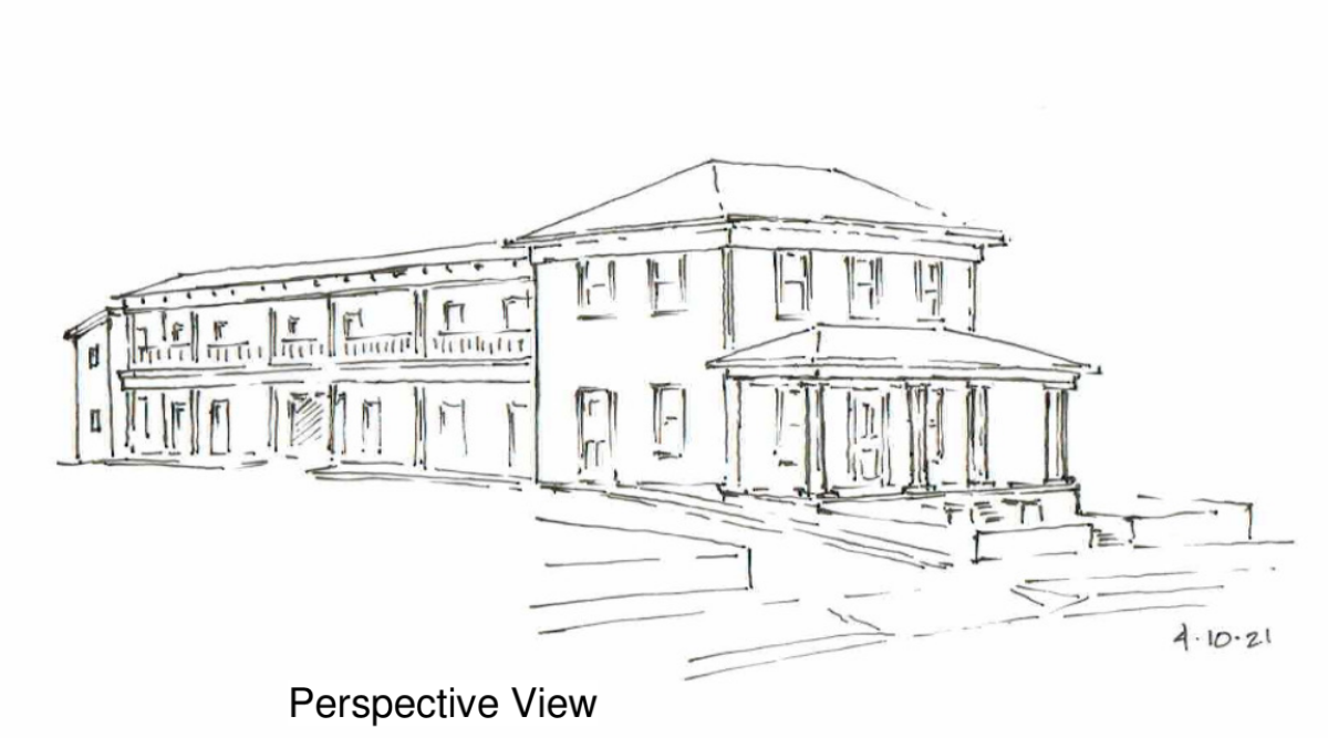 The project submitted a site plan, floor plan and elevation that show a long building with a traditional two-story home façade that blends in with the fabric of the surrounding neighborhood. The project’s front area would feature a shared porch, laundry area and office space, which would also provide access to the two-story, wrap-around porch where entrances to each of the twelve units would be located.