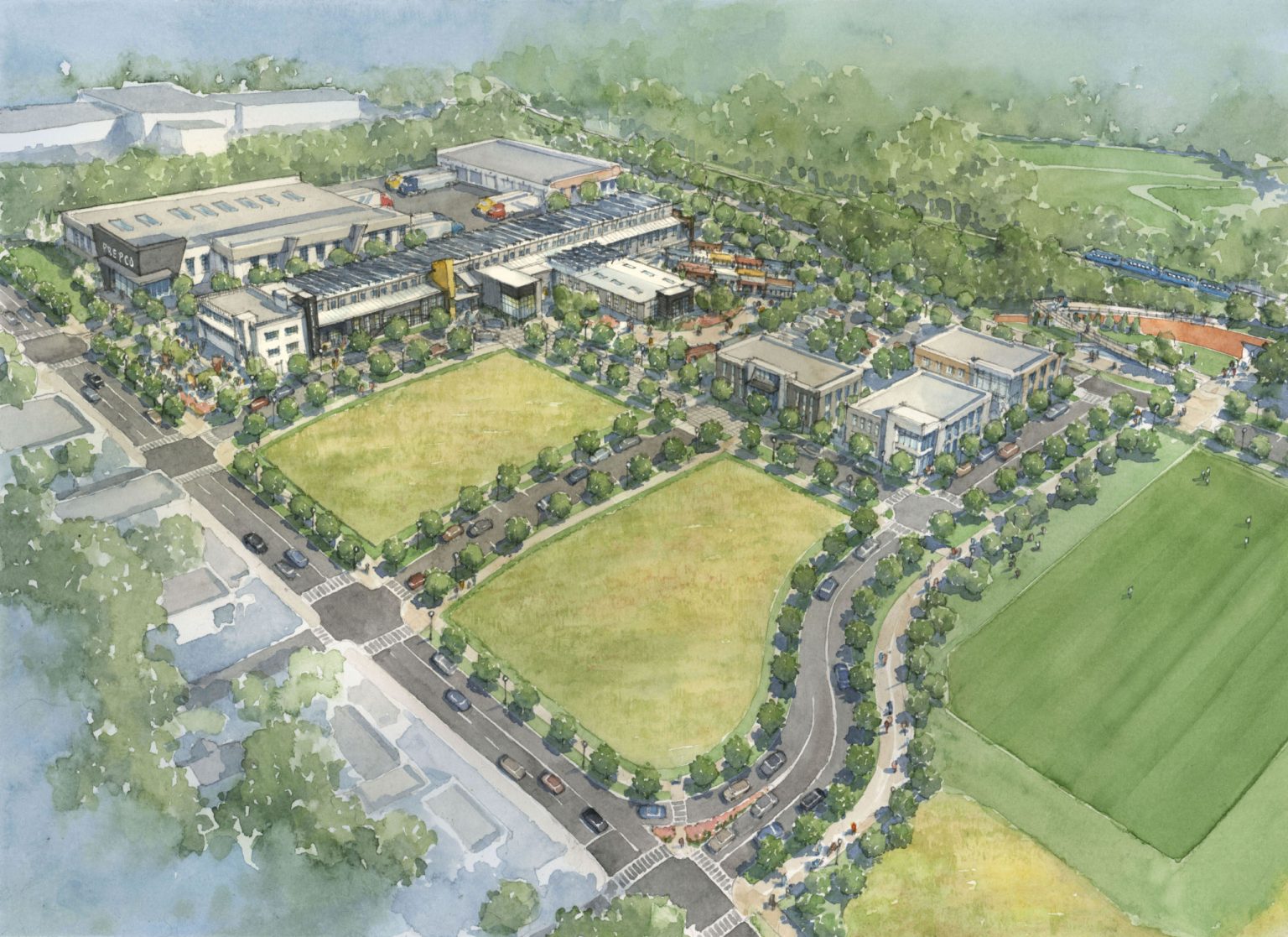 A large, natural-turf green space will be created, along with a business-centric area that features repurposed shipping containers that will be used as workspaces and storefronts.