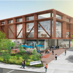 The new two-story building is proposed to provide an “outside the gates” presence.