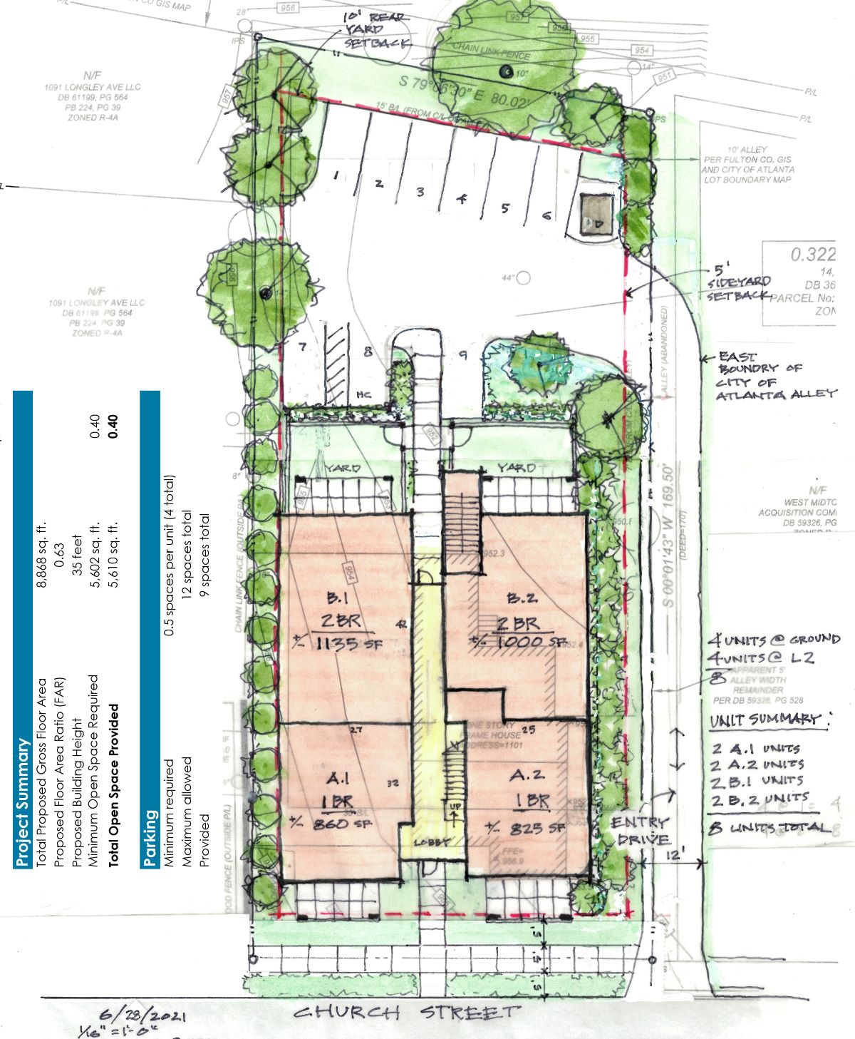 The 1101 Church Street would include four 1-bedroom units between 825 and 860 square feet, and four 2-bedroom units between 1,000 and 1,135 square feet. The application estimates that the units will be sold for approximately $500,000 to $600,000 each. The site is located on the corner of the Knight Park Neighborhood, adjacent to commercial buildings and within walking distance to several parks and transit stations.