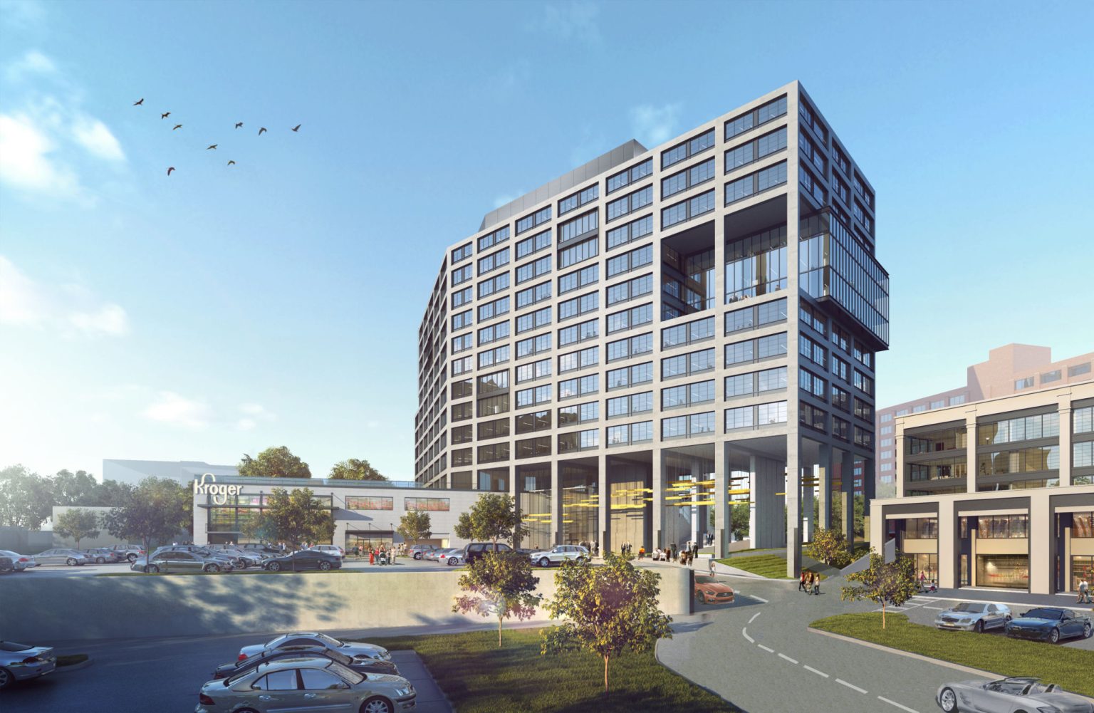 The footprint of the ground-floor Kroger is positioned within the existing street grid with one wing of the office tower rising above, with a 2,500-square-foot porch connecting the Beltline and a walk-up-window Starbucks coffee shop.