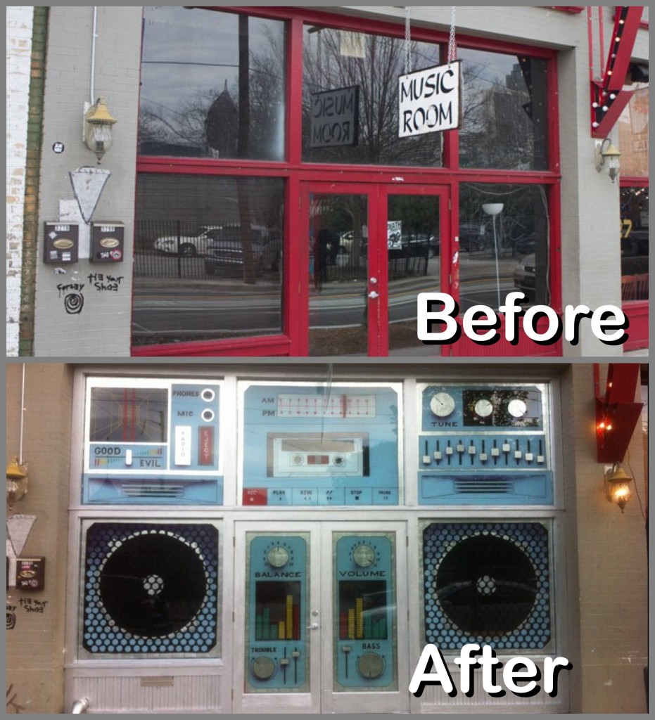 I love seeing under-utilized areas like the Old Fourth Ward, and Edgewood Avenue in particular, become bastions of creative expression and entrepreneurship. Unfortunately, the City of Atlanta can’t seem to get out of its own way to let this type of creativity flourish. The Department of Planning and Community Development (Office of Buildings) has recently placed a moratorium on window-mounted signs. Under this new moratorium (and potential pending legislation), the Music Room’s creative use of window space would be deemed illegal, even though it is all contained on the INTERIOR of the space.