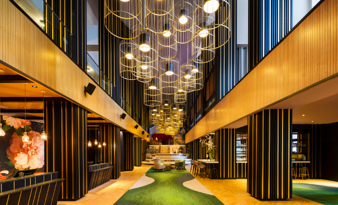 The design for the public spaces, including “Welcome” (the hotel’s lobby) and “The Living Room” (the hotel’s restaurant), features a “forbidden garden motif” that draws inspiration “from Atlanta’s home within a forest and all the beautiful flora and fauna in the city.”