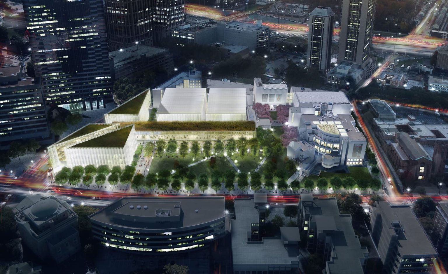 Image depicts a new park, green roofs, better street visibility along Peachtree.