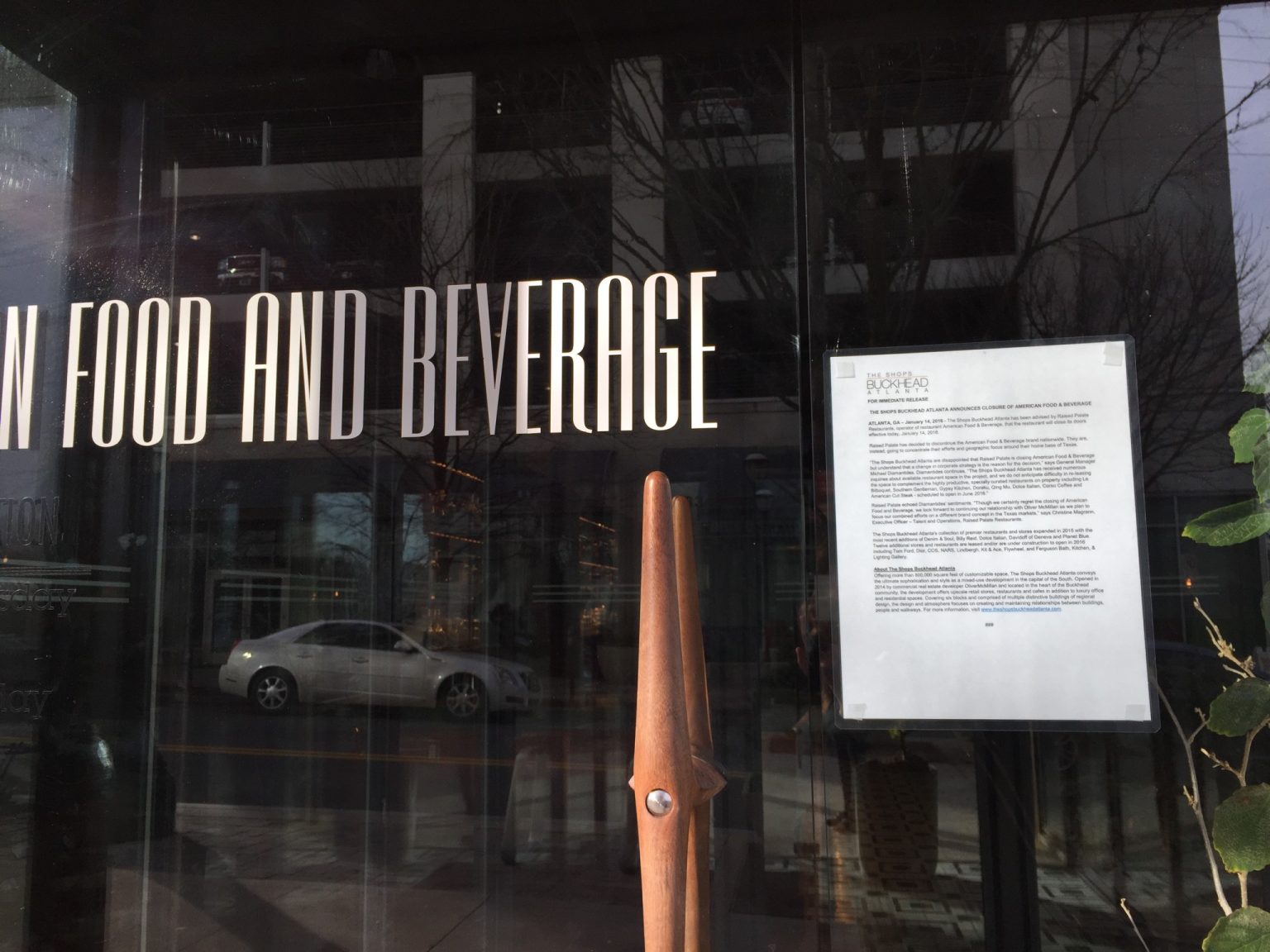 “The Shops Buckhead Atlanta is disappointed that Raised Palate is closing American Food & Beverage but understand that a change in corporate strategy is the reason for the decision,” said General Manager Michael Diamantides in Thursday’s press release.