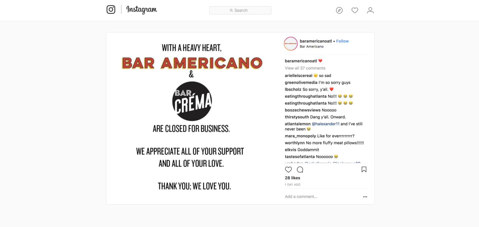 Bar Americano and Bar Crema shuttered in Buckhead Saturday night after a short six-month stint, the Atlanta-Journal Constitution Sunday first reported.
