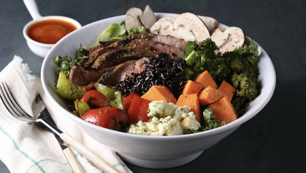 Menu items include bowls such as Highway 29 (with brown rice, balsamic-glazed brussel sprouts, chicken, cowboy caviar, citrus marinated avocado and sriracha crème) and Chicken and Falafel (with herb-and-citrus grilled chicken, balsamic-glazed brussel sprouts, falafel, chili-roasted cauliflower, brown rice, cherry tomatoes, cucumbers, vinaigrette and parmesan cheese). There are also salads, build-your-own bowl options, family meals and grab-n-go options.