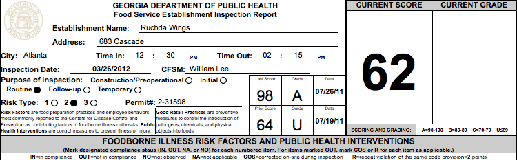 Failed inspection: March 26, 2012 Score: 62, Grade: U (Full report and violations)