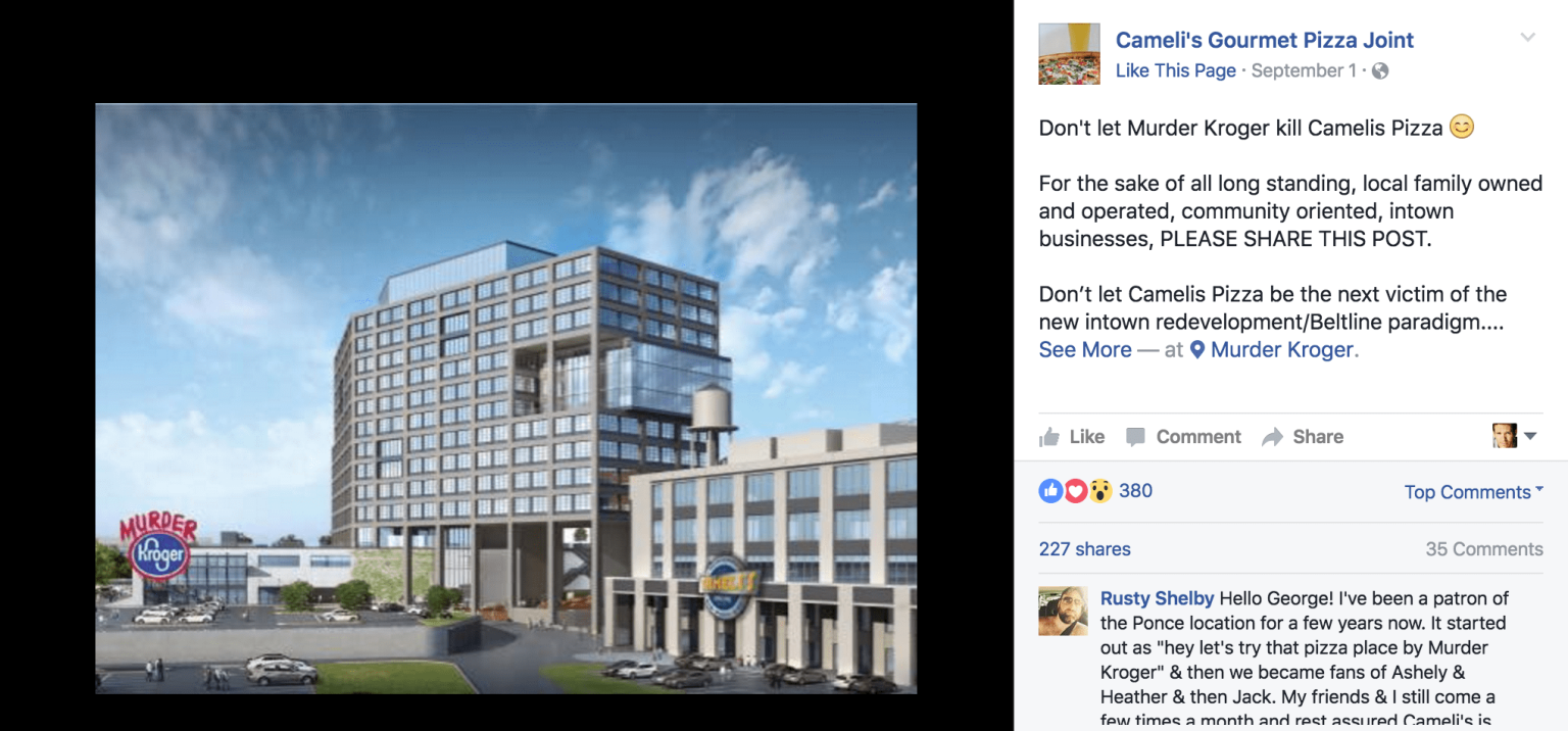 “Don’t let Murder Kroger kill Cameli’s Pizza,” Cameli Thursday posted to the restaurant’s page. “Don’t let Cameli’s Pizza be the next victim of the new intown redevelopment/Beltline paradigm.”