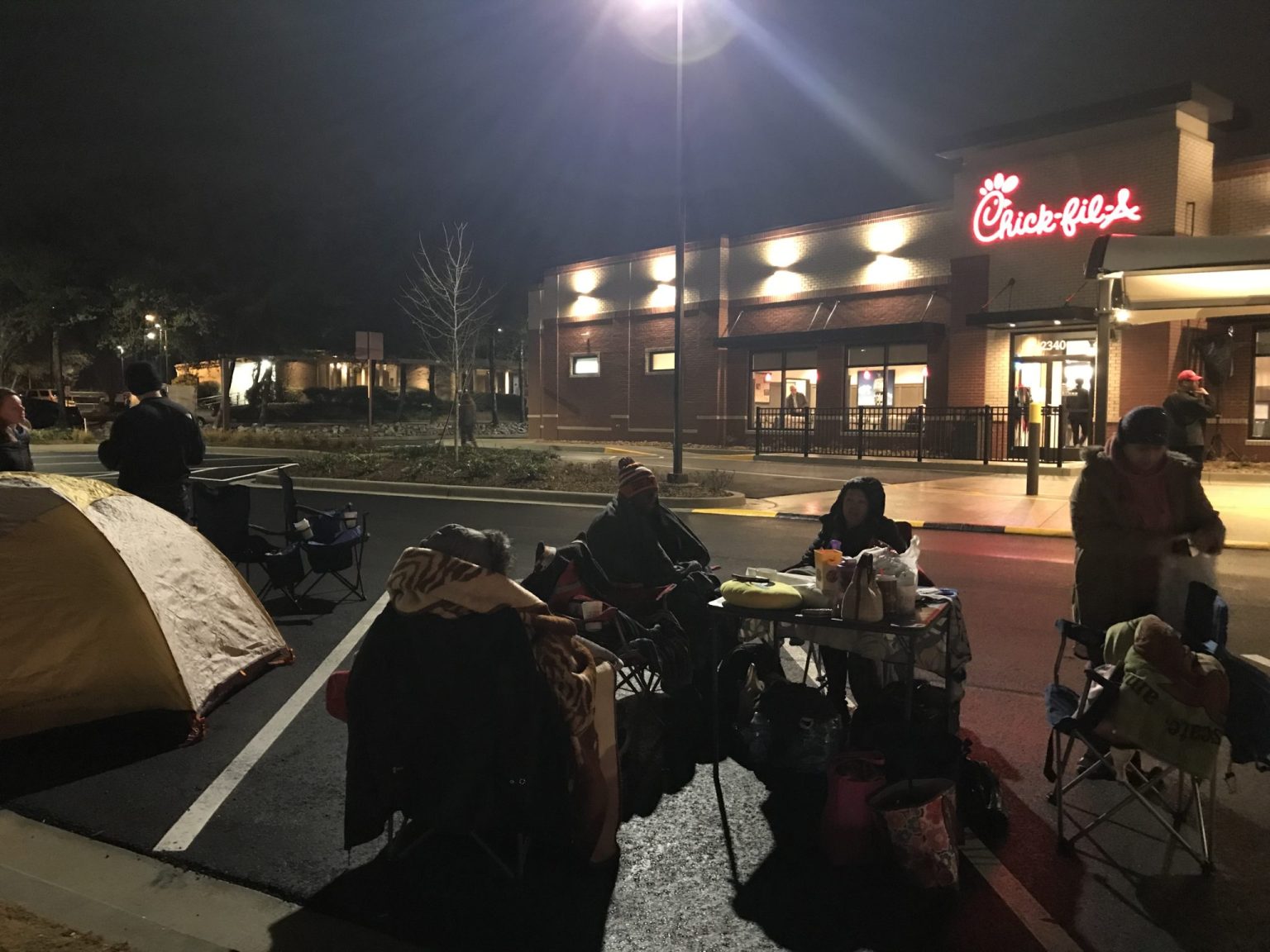 Nearly 40 people have already set up in the parking lot of the newly rebuilt North Druid Hills location of Chick-fil-A in preparation for its reopening Jan. 11.