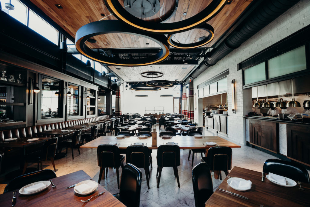 Designed by The Johnson Studio at Cooper Carry, Ecco Phipps Plaza’s interior boasts marble tiled flooring, suspended wood-planked ceiling panels and circular chandeliers of varying sizes juxtapose industrial influences with sleek silhouettes, flanked by an open kitchen that allows guests a look behind the scenes.