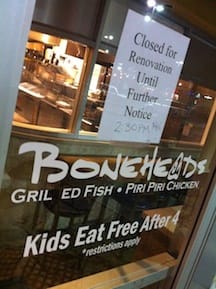 Boneheads Grilled Fish and Piri Piri Chicken has closed their Buckhead location.