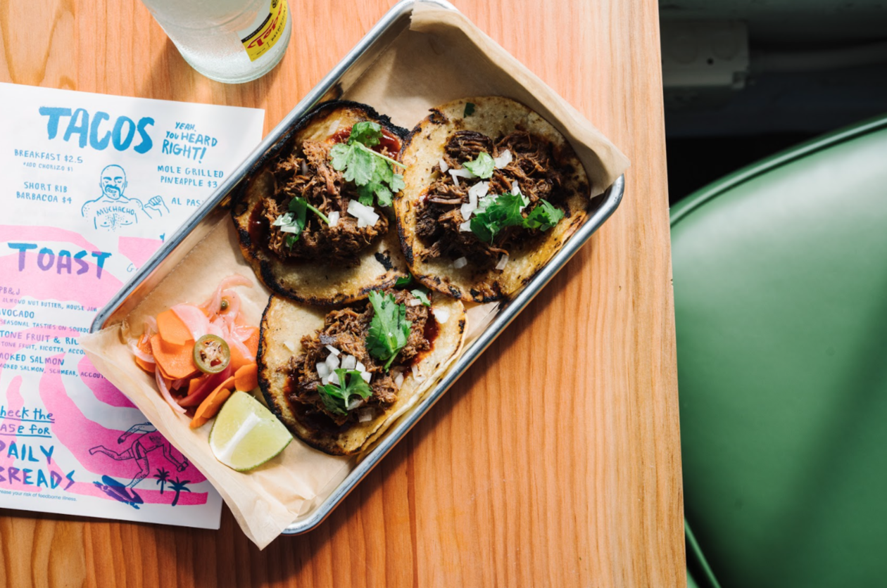 Open seven days per week from 7am to 4pm, counter service at Muchacho offers a menu of breakfast and lunch tacos, toasts, grain bowls, poke and pastries, plus a drink list featuring a handful of canned beer and wine, cocktails and housemade agua frescas.