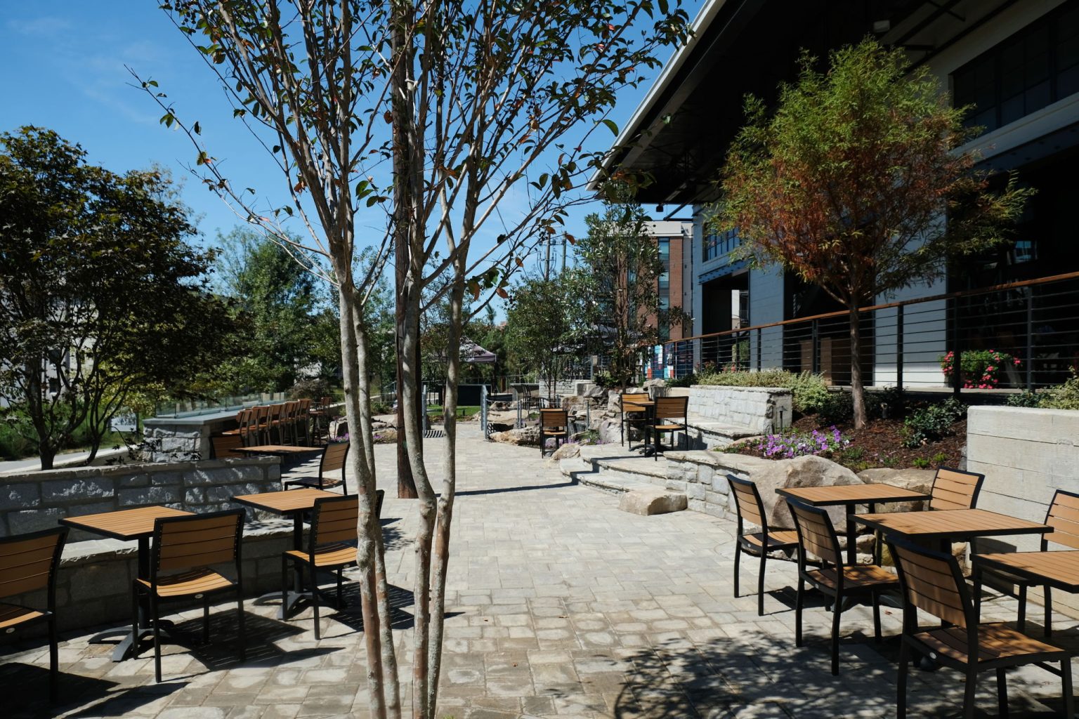 New Realm Brewing’s beer garden includes stone seating with fire pit tables, water features, stone pavers, and over 200 newly planted trees and bushes.