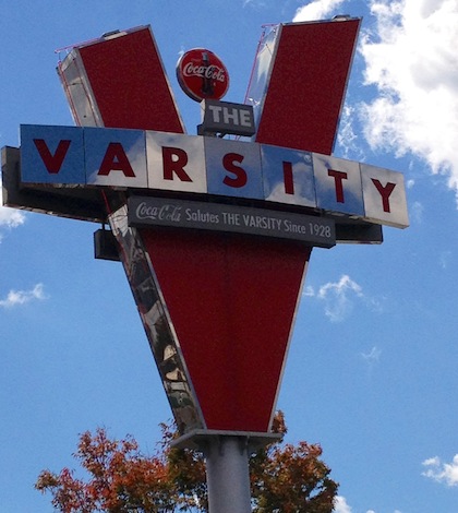 Of course, without the lingo, maybe there never could have been a Varsity experience. Sometimes, you have to pick one or the other. So, I am going to stop asking questions and get back in the long line here at the Varsity. If you are wondering what’ll I have — I am thinking Heavy Weight (hot dog with extra chili) and Ring One (onion rings). This time, I’m going to pass on the Naked Walking Dog — even though local legend has it that if you put it in your refrigerator, you can hear it bark during the night.