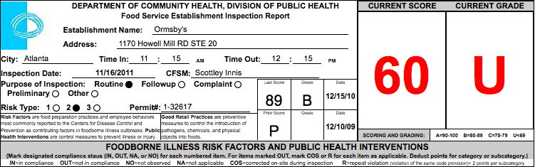 Failed inspection: November 16, 2011 Score: 60, Grade: U (Full report and violations)