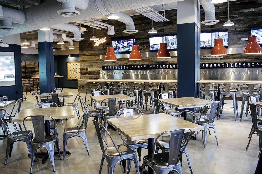 Pour Taproom has two 16-foot double accordion style doors to connect the indoor space with the outdoor area and 12-foot oak and steel bar tables designed by Summit Design Company include built-in charging stations for electronic devices.