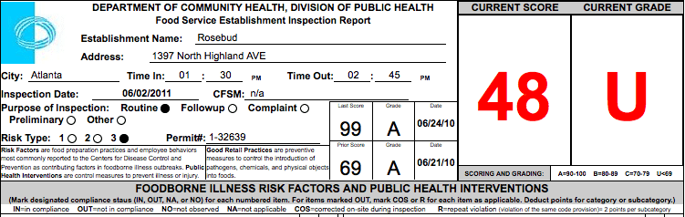 So what’s considered failing? Though different from one health inspector to the next, the industry standard is that anything below a 70 (out of 100) is failing, according to April Majors, public information officer for the Fulton County Environmental Health Services Department.