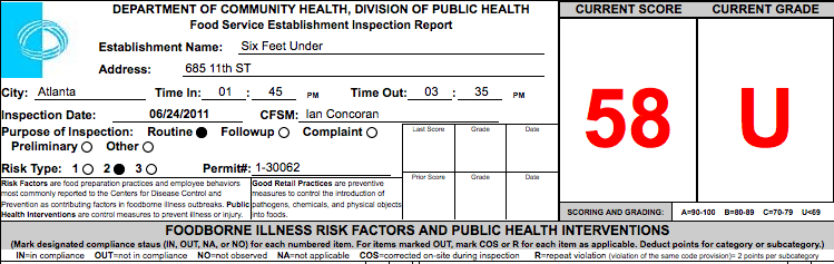 Some of these scores are not accurate. Six Feet Under for instance was marked off 6 points just for having a garbage can on the wring side of a hand washing station. That was just one of the many things they were marked off for that was at the discretion of the inspector. They also have never been below a 90 since they opened. I think some of the people in Fulton county are going overboard and not taking into consideration that it is a working operation. Yes, when you are doing $20-$30K a day, there might be a couple of things out of place during the lunch rush. I understand some of these places really are bad, however, I would look at the previous scores for right now (until the health department comes up with a concrete system) for an accurate representation of what’s going on. Right now the inspectors are using too much of their own opinions when marking off points.