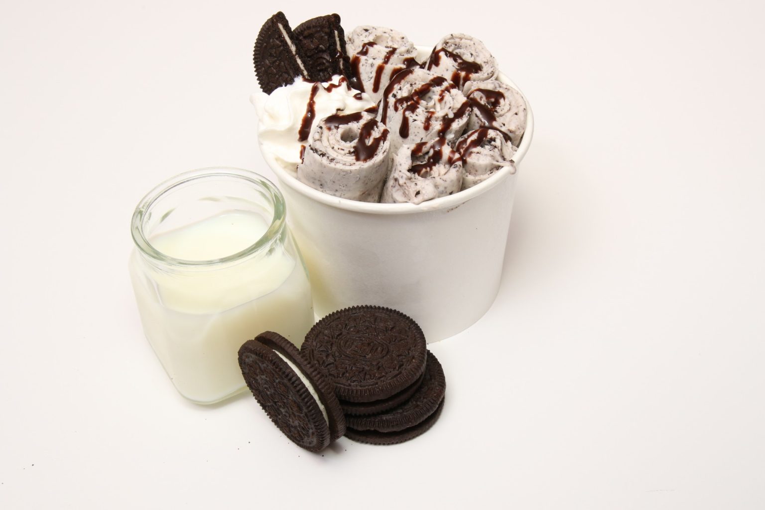 Ice cream rolls are served straight up in a cup or on a Sublime Doughnut, also known as the “Tall Charlie.”
