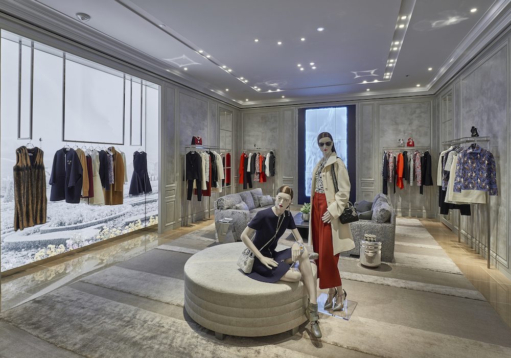 Dior’s signature handbags and small leather goods are located within the first salon upon entering the boutique, followed by a dedicated footwear lounge and complete with a ready-to-wear salon.