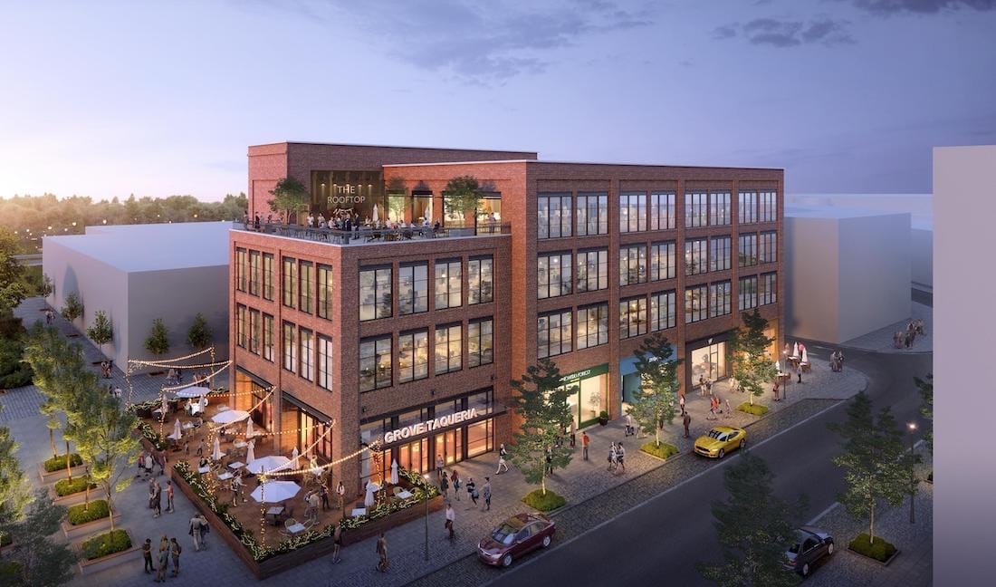The structure will include restaurant and retail space at the street level, three floors of creative loft and medical office space as well as an “activated” 2,500-square-foot rooftop with restaurant and bar overlooking the Grove and Central Plaza below.