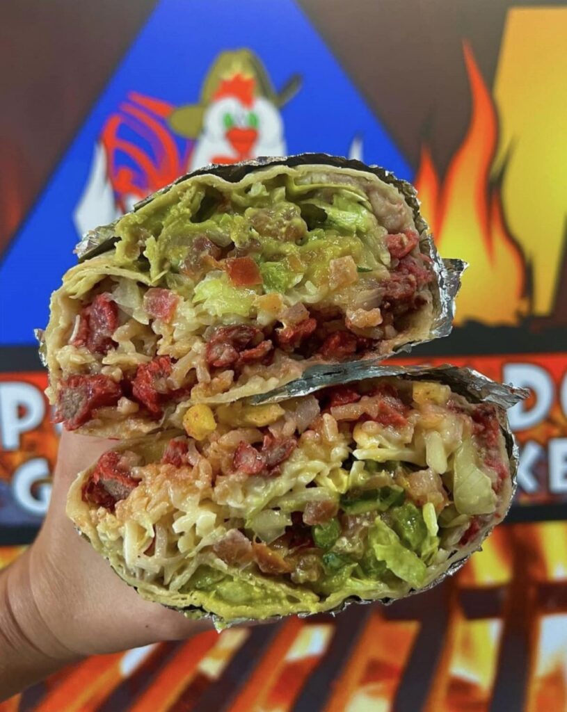 El Pollo Rico’s menu includes charcoal-grilled chicken meals with a variety of sides—rice, refried beans, and sweet plantains, to name a few. A few starters include chips and queso, guacamole, or chips and salsa. Diners can also enjoy flautas, quesadillas, tacos, burritos, and burgers. Flan, churros, and tres leches are dessert options.
