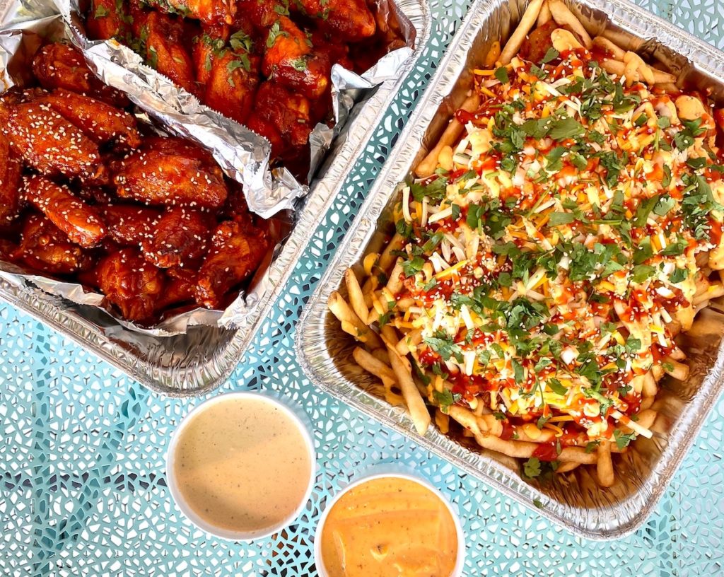 Chi’Lantro’s simple menu is composed of three principal items: chicken wings, customizable bowls, and their signature kimchi fries. For drinks, the chain offers cane sugar soda, aguas frescas, and iced tea.