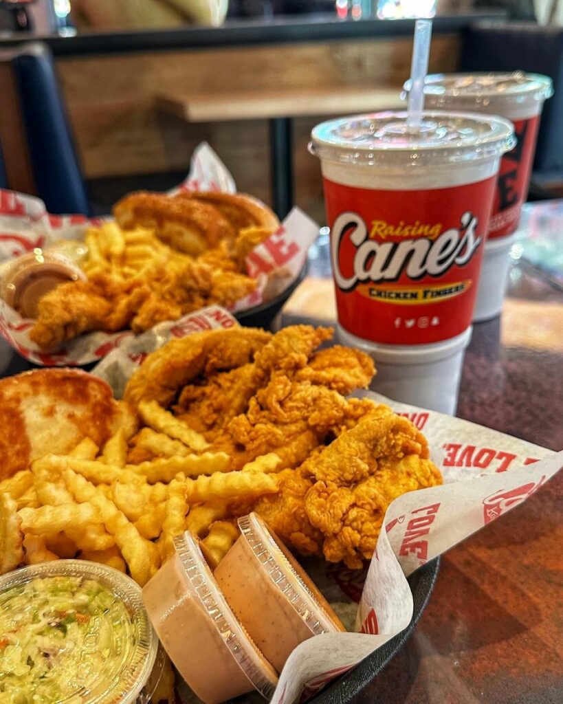 Of course chicken fingers, along with the brand’s signature dipping sauce called Cane’s Sauce, feature heavily on the menu, but the chain also offers a chicken sandwich. Sides include crinkle cut fries, cole slaw and Texas toast, with beverages like tea, available sweet and unsweet, lemonade and fountain drinks.