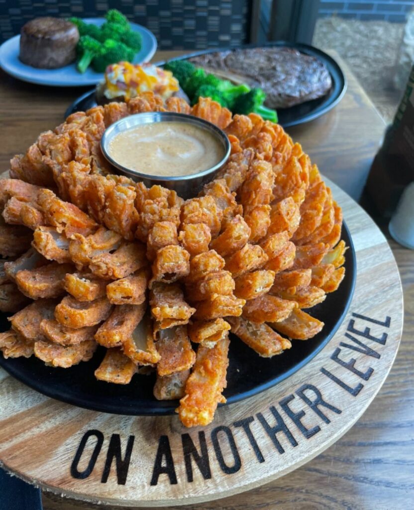 The steakhouse chain is famous for its cuts of mouth-watering steak, as well as for its signature appetizer called the bloomin’ onion, which is a whole onion cut into segments that resemble flower petals, that are battered and fried, then served with a spicy dipping sauce.