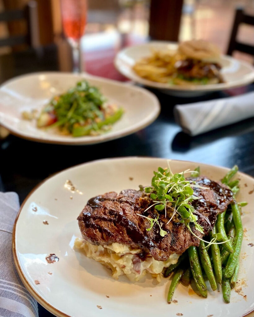 Mains include chicken and waffles made from smoked pulled chicken piled atop waffles and drizzled with spicy maple syrup, along with BBQ mac and cheese, and choice of meats topped on the creamy pasta include pork, brisket, burnt ends or kielbasa.