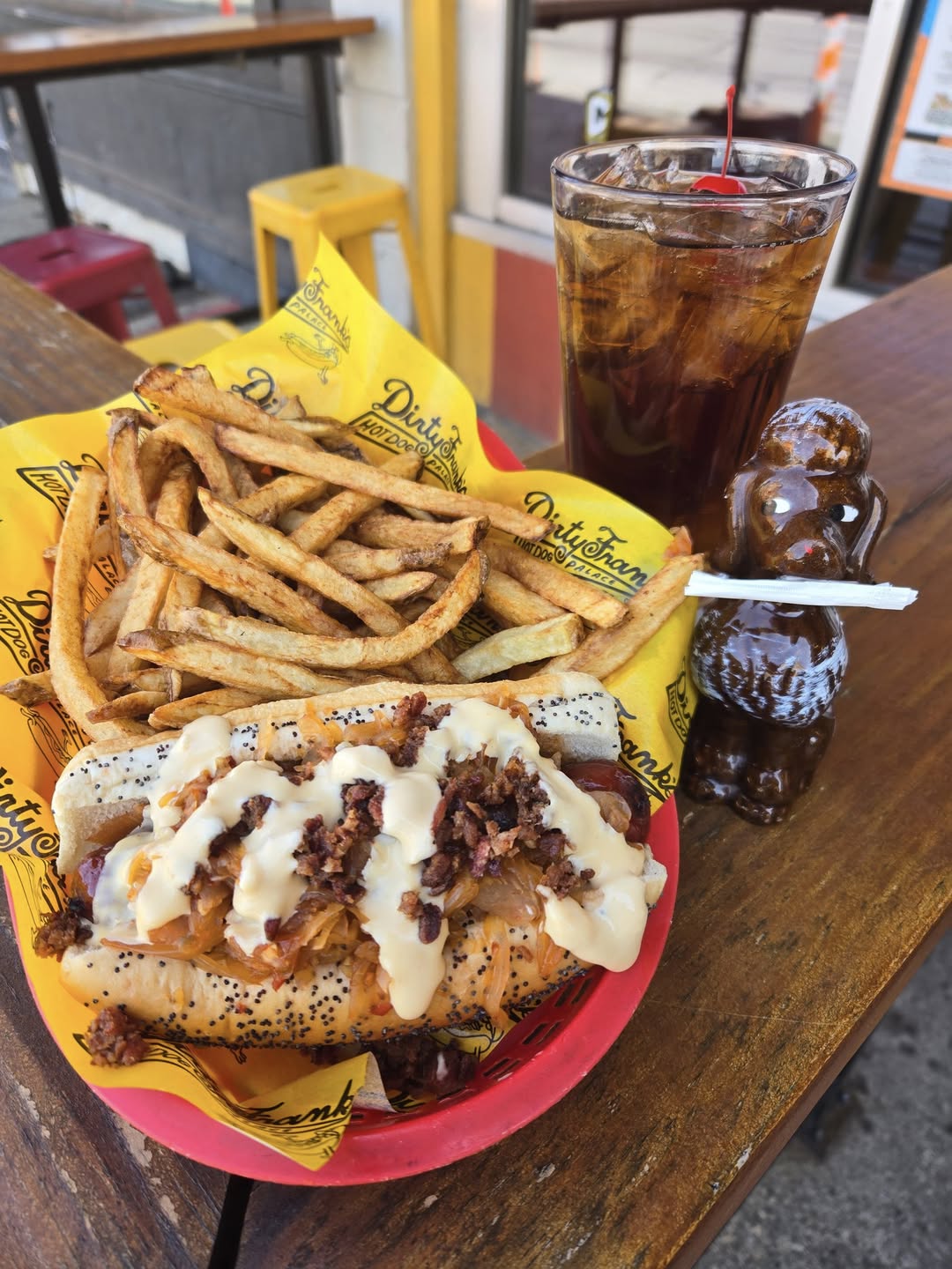 Dirty Frank’s isn’t your average hot dog joint. Their menu boasts over 28 unique hot dog variations and 30+ toppings to mix and match — from the classic to the wildly creative. Craving more than a dog? They’ve got you covered with big, sloppy plates like loaded nachos, chili mac, and a slew of sides including sriracha slaw, soft pretzel bites, Boston baked beans, fries, salad, and “tot-chos” (yep, nachos made with tater tots).