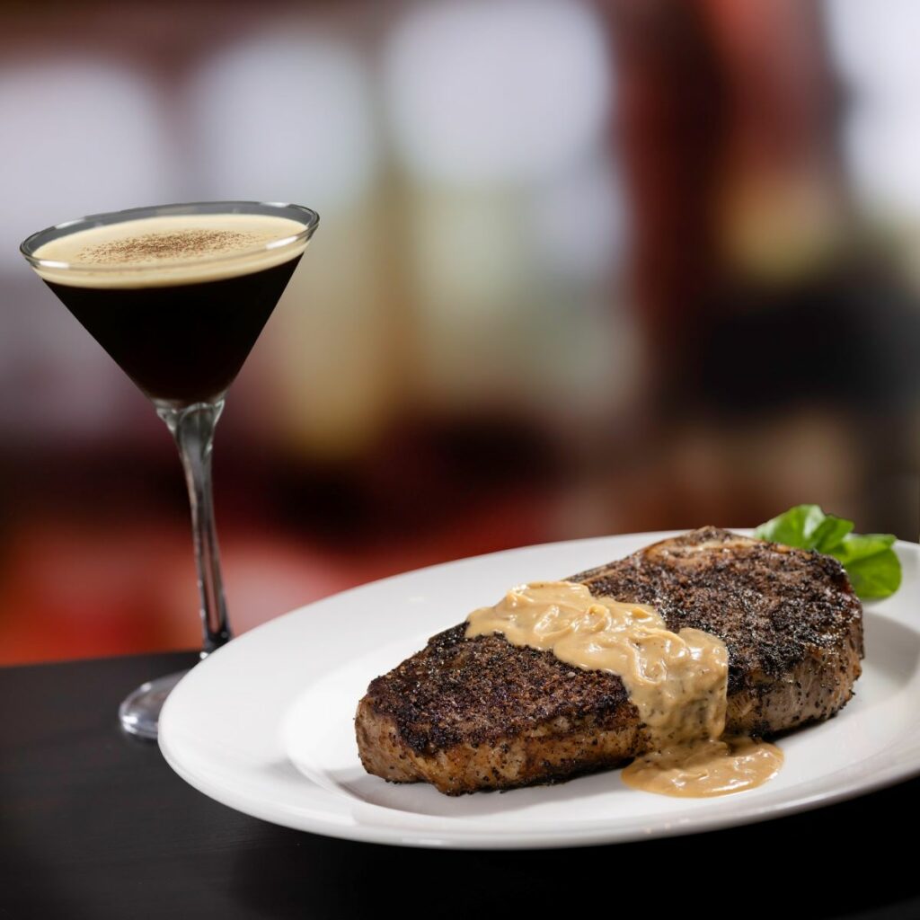 In addition to steaks, the eatery also has a seafood selection including oysters, lobster and crab cakes, tuna and salmon. There’s also a number of desserts offered including cheesecake and creme brulee, along with cocktails and an extensive wine list.