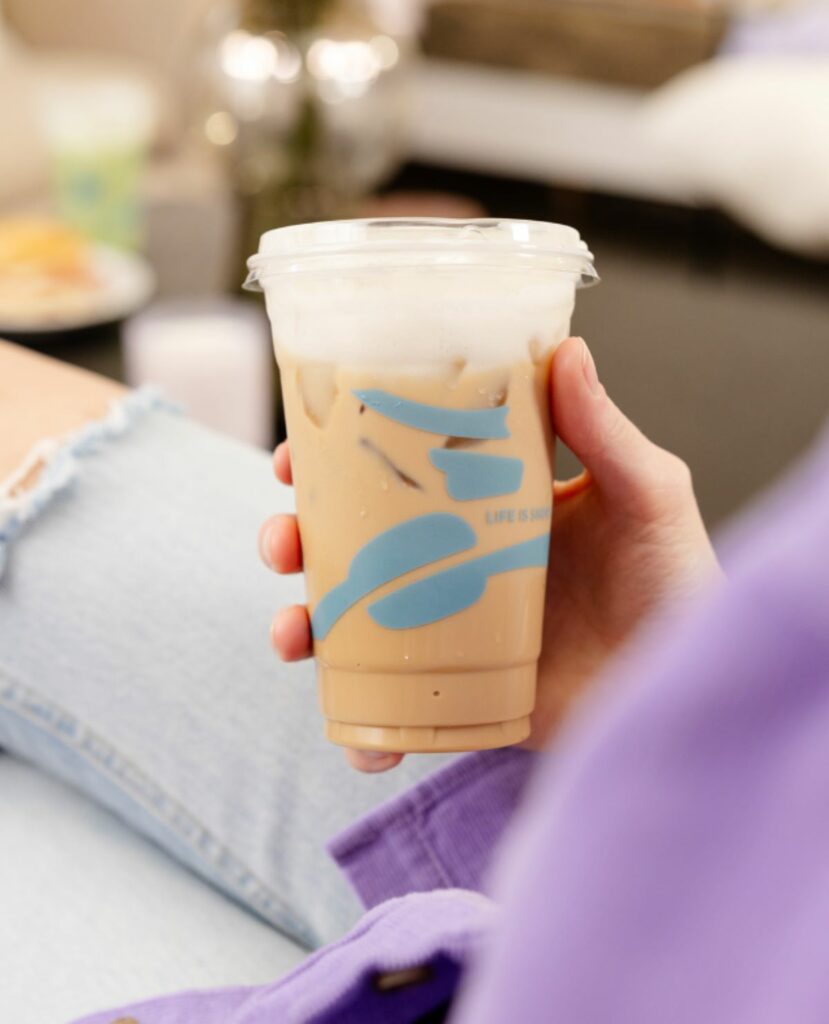 The drink menu features hot and iced espresso beverages and drip coffee, as well as tea and cocoa. There are also seasonal beverages like lavender infused drinks such as the lavender matcha latte and iced white mocha with lavender cold foam. In addition to selling ready made drinks, guests can also find a selection of bagged coffee beans. Food items include breakfast favorites like bagels, pastries and sandwiches like ham and cheese croissant or the turkey and provolone on an asiago bagel.