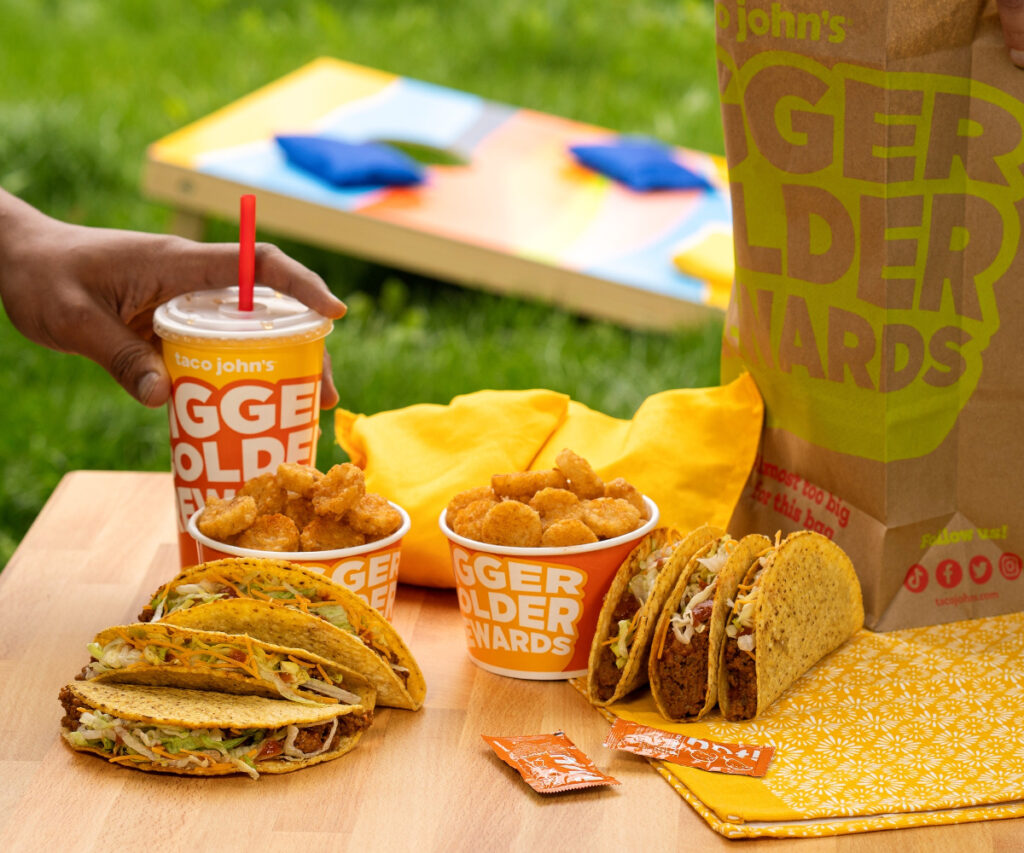 Menu options at Taco John’s includes tacos in a variety of proteins including beef and chicken, along with burritos and the chain eatery’s signature potato dish, potato olés, which are bite-sized, disc shaped fried hash browns. Customers can order their potato olés plain or loaded up nacho style with ground beef, beans, cheese, guacamole, tomatoes and sour cream.