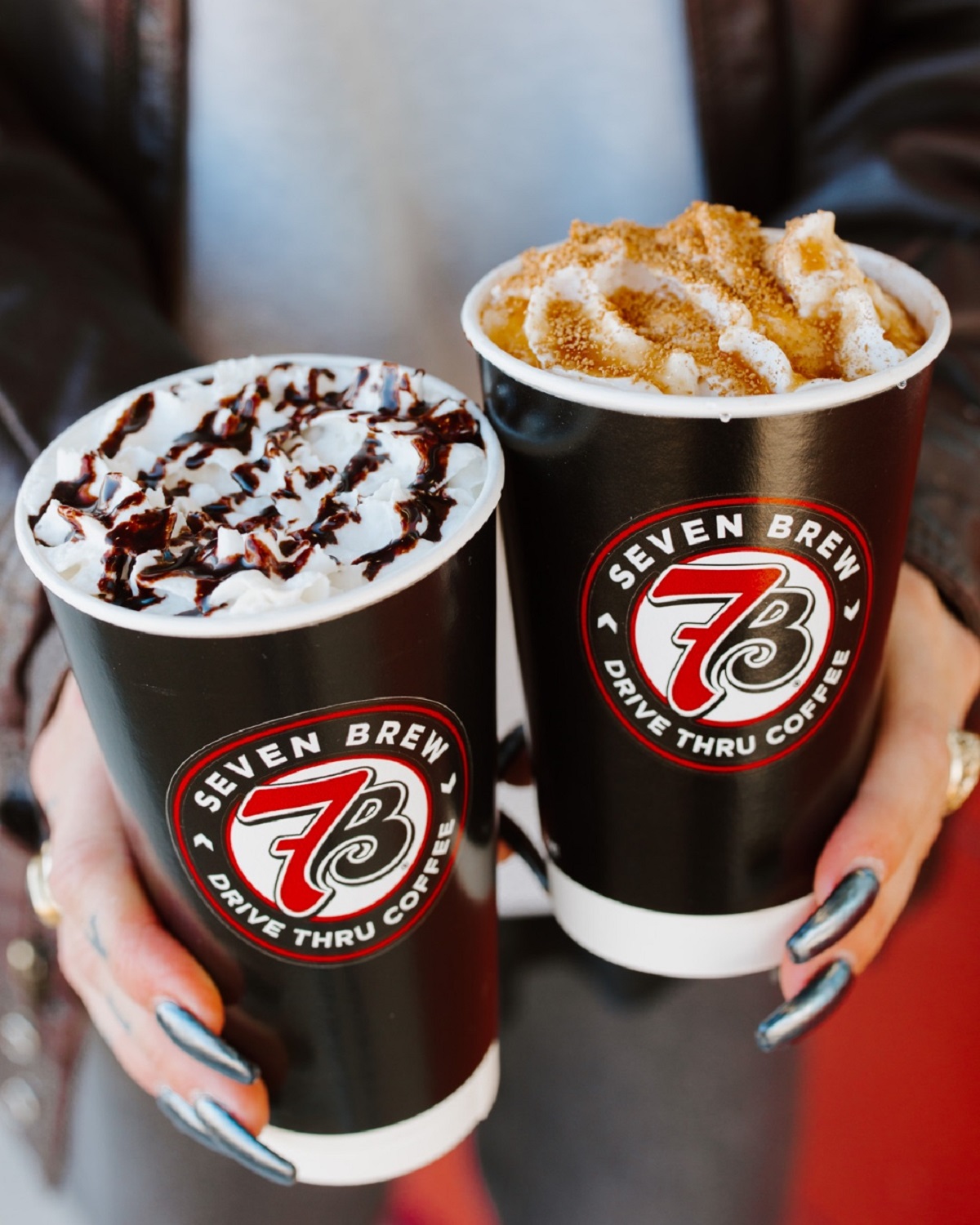 The 7 Brew menu features The Seven Originals—Blondie, Brunette with hazelnut and caramel mocha, Smooth with white chocolate and Irish cream breve, Cinnamon Roll, White Chocolate Mocha, German Chocolate, and Triple 7, which is a Smooth with six espresso shots. Classics such as lattes, mochas, caramel macchiato, chai tea, cappuccinos, and cocoa are also on the menu.