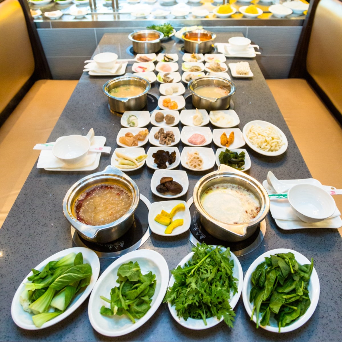 Diners can choose from a variety of soups and then cook the ingredients in the soup at their tables. Protein ingredients include chicken, pork, lamb, and ribeye, with add-ons such as lobster and crab available. They can also choose to order barbecue options from the grill.