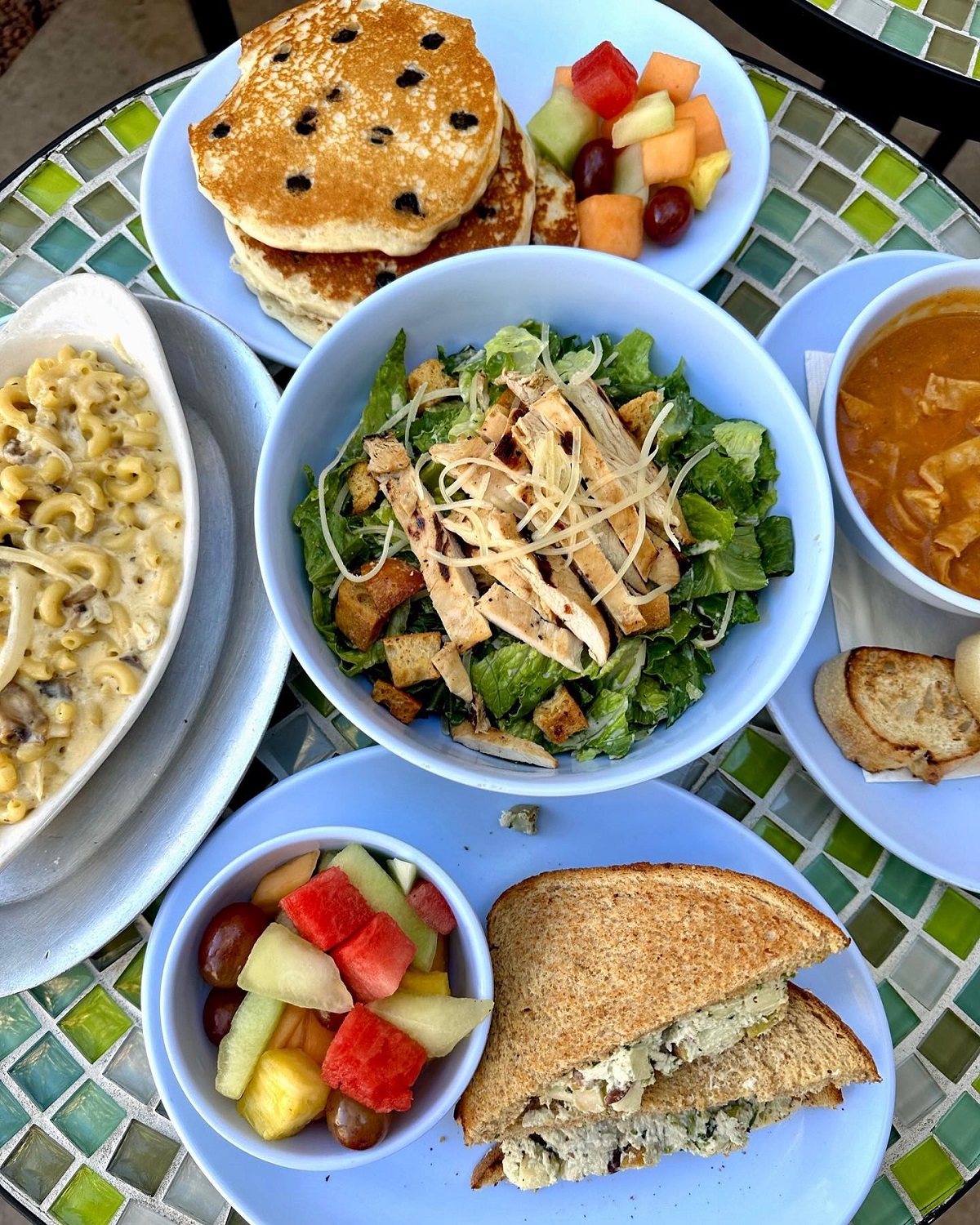 The extensive menu at Rachel’s Kitchen features an array of options including salads, wraps, sandwiches, pastas, and fresh squeezed juices. Some breakfast options include a burrito, pancakes, and Old-Fashioned Oatmeal. Lunch options are Grilled Vegetable & Chicken Salad, Ultimate Grilled Cheese, and the Albacore Tuna Wrap. Juices, smoothies, and coffees are also available, as well as desserts of muffins, cookies, and more.