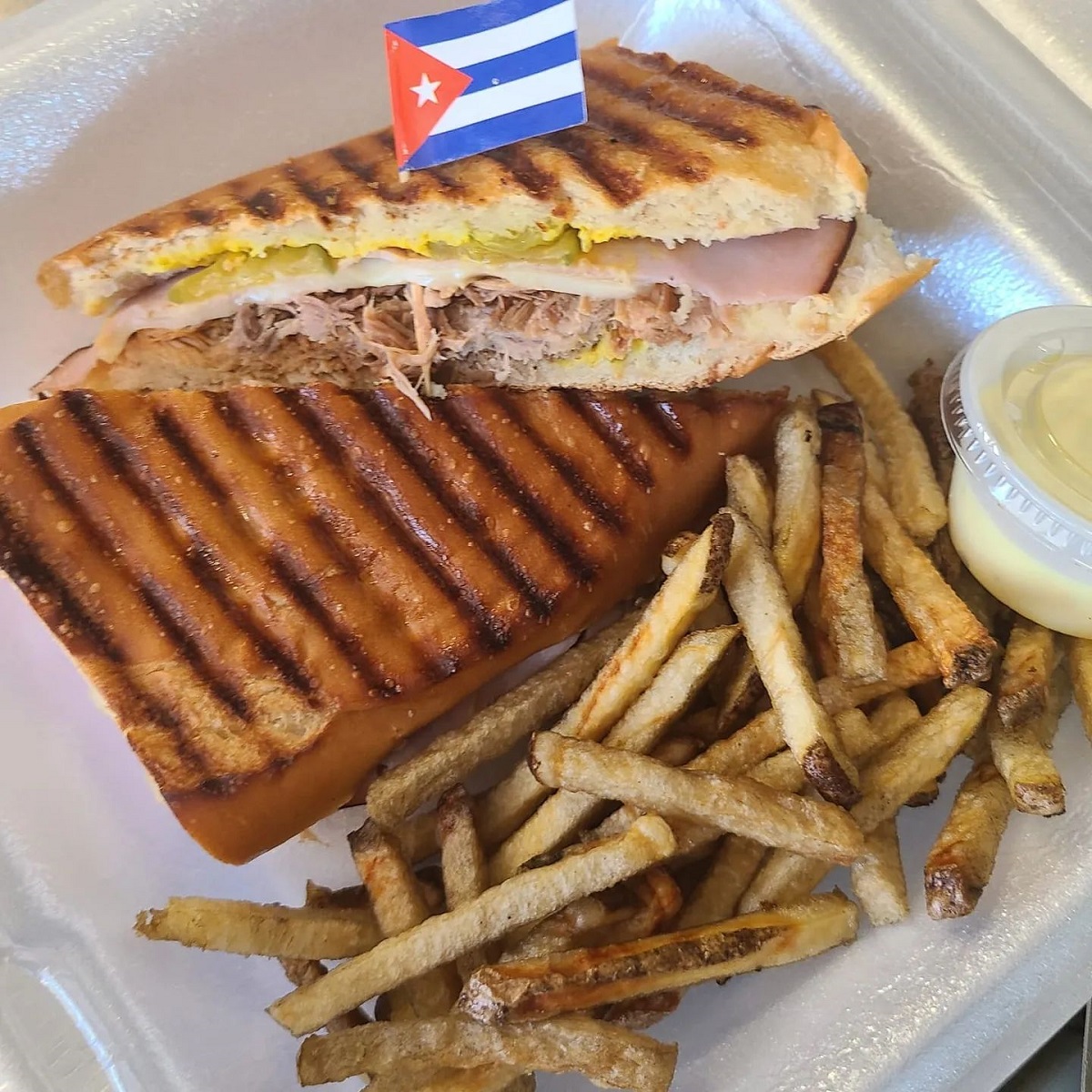 They are in the process of finalizing the restaurant menu, but at the food truck, Lolas offers meals of rice, salad, and a protein—fried chicken, roasted pork, shredded beef, and more. Sandwiches include Cuban burger, Cuban sandwich, and the pork steak sandwich. Sides of rice, fried plantains, yucca, and French fries are also options.