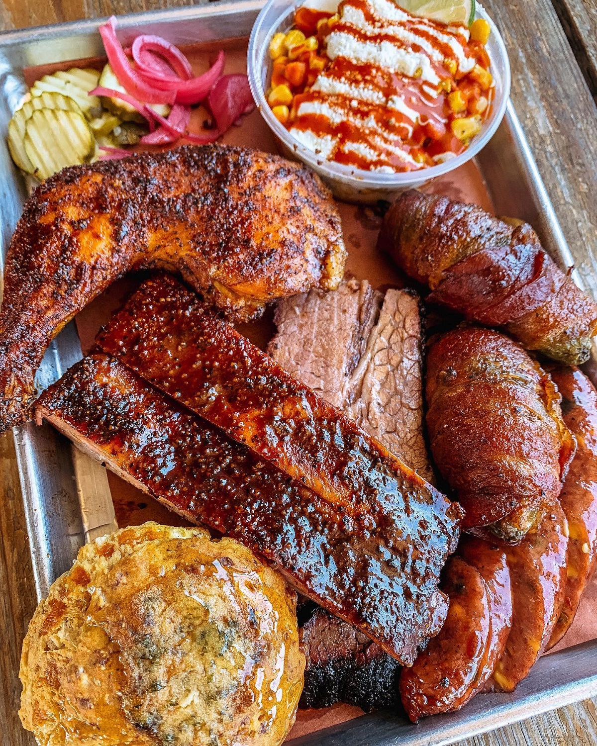 The menu features large plates of ribs, house sausage, brisket, smoked turkey, pork belly burnt ends, and more. And don’t forget the sides! Hatch Chile Mac ‘N Cheese, Smoked Elote, and Baked Potato Salad are just a few examples of tasty sides that pair well with your selection of meats. Tortillas are also available.